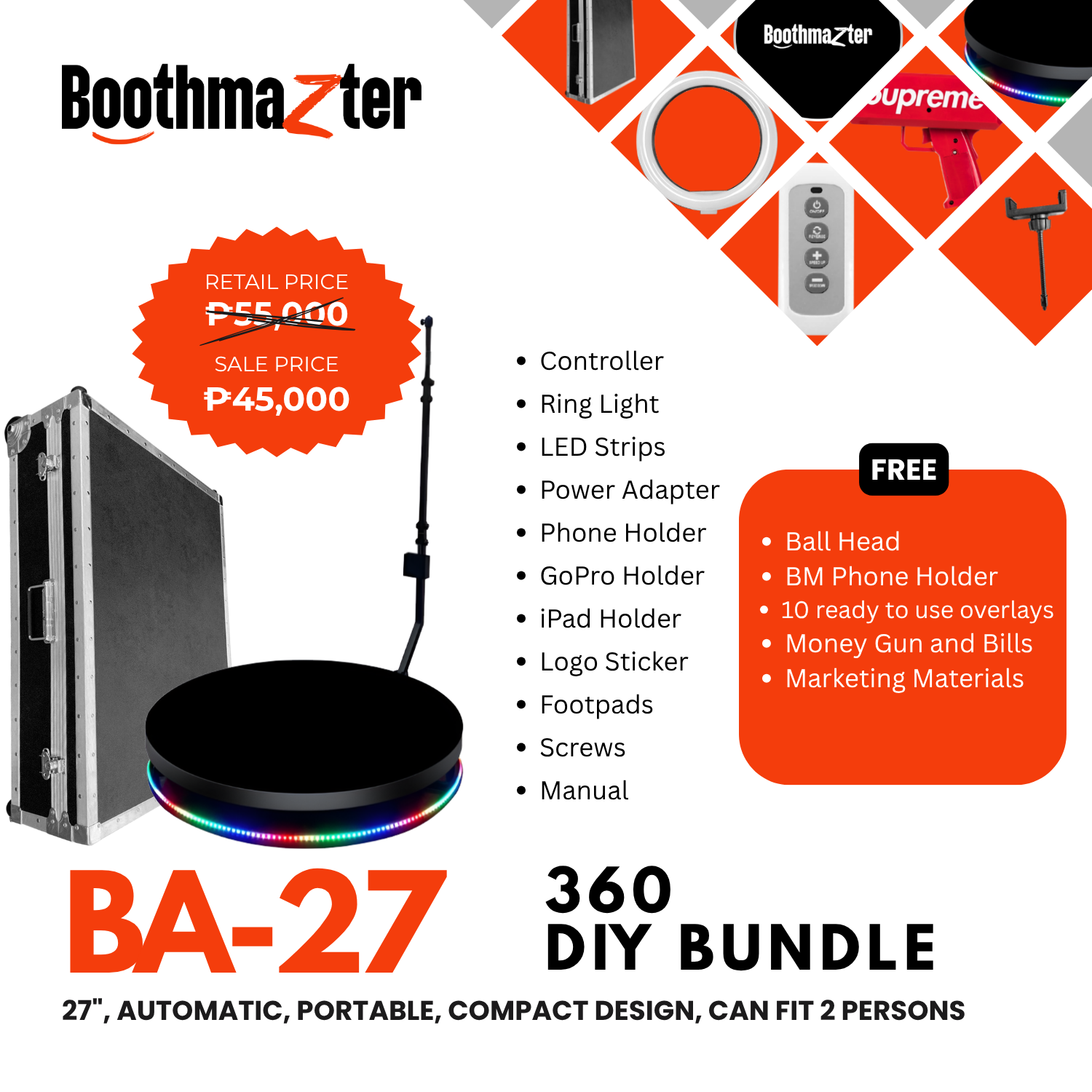 Start your 360 business on a budget! This 27″ 360 Video Booth platform is compact but powerful — perfect for solo shots or couples. Comes with a durable travel case for safe transport. Affordable, easy to set up, and ready for your custom add-ons.